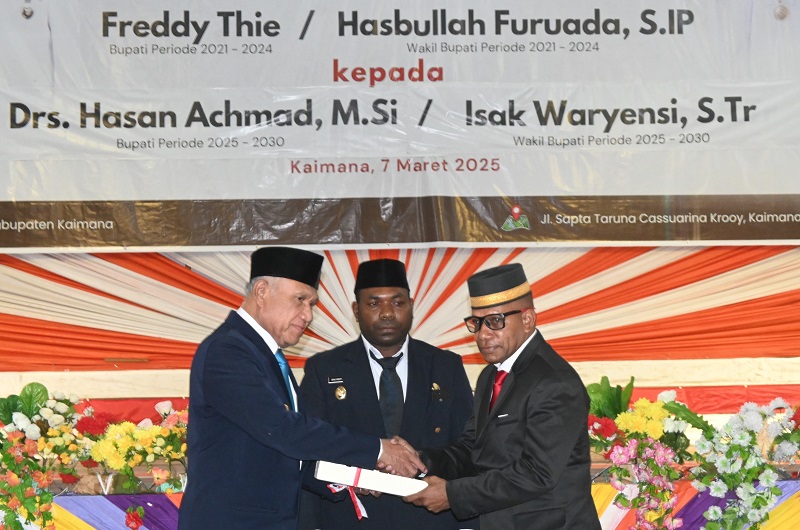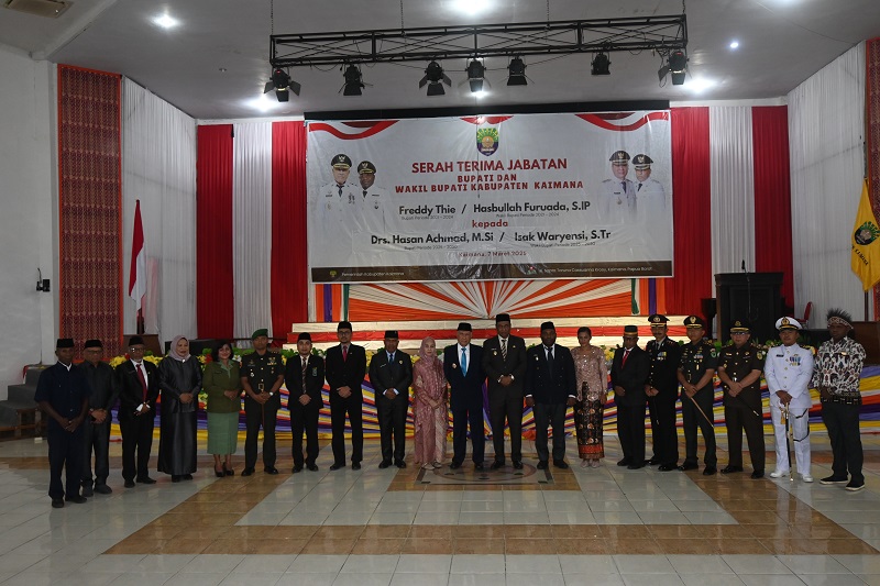 KOMINFO KAIMANA – Serah terima jabatan (Sertijab) Kepala Daerah Kabupaten Kaimana dari Bupati Freddy Thie dan Wakil Bupati Hasbulla Furuada, S.P. kepada Bupati Drs. Hasan Achmad, M.Si dan Wakil Bupati Isak Wariensi, S.Tr. yang dihadiri oleh Wakil Gubernur Papua Barat, Drs. Mohammad Lakotani, M.Si pada hari Jumat (07/03/2025) bertempat di Gedung Serbaguna Krooy Kaimana.