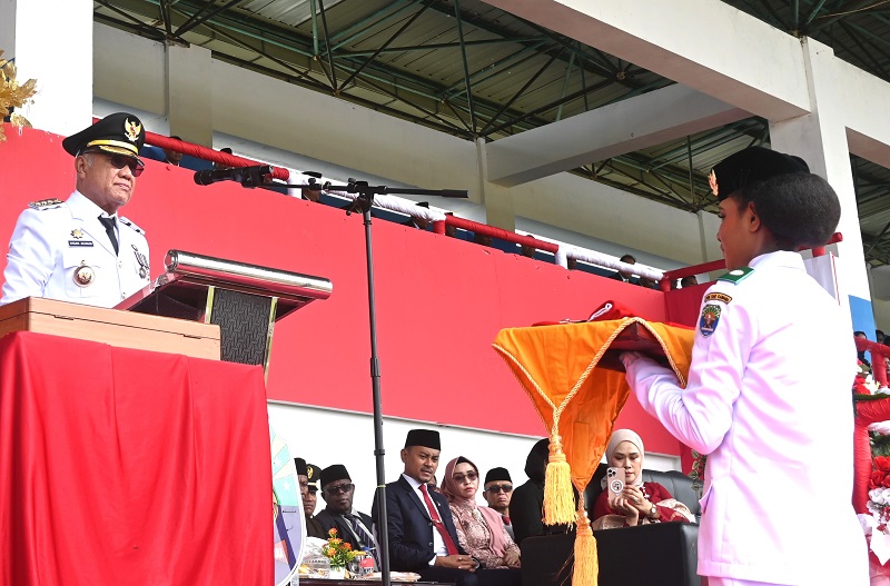 Bupati Kaimana Drs. Hasan Achmad, M. Si., sebagai Inspektur Upacara Pada Peringatan Detik-detik Proklamasi dan Pengibaran Bendera pada HUT RI Ke – 80 yang dipusatkan di Stadion Triton Kaimana